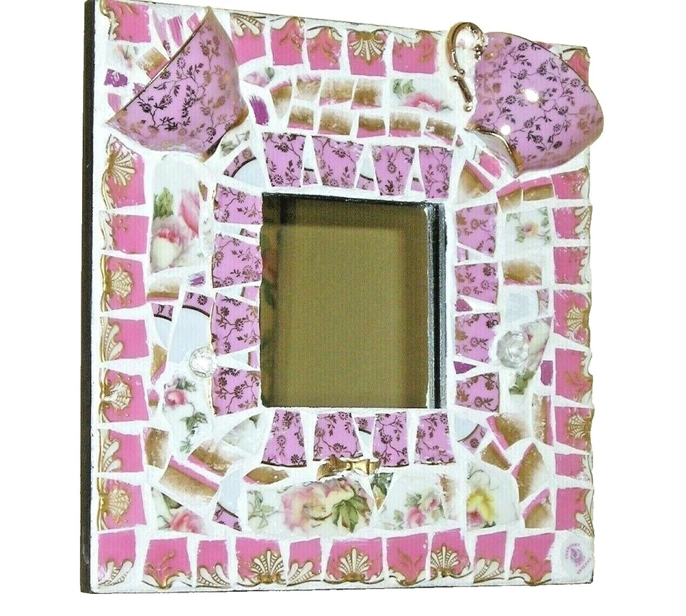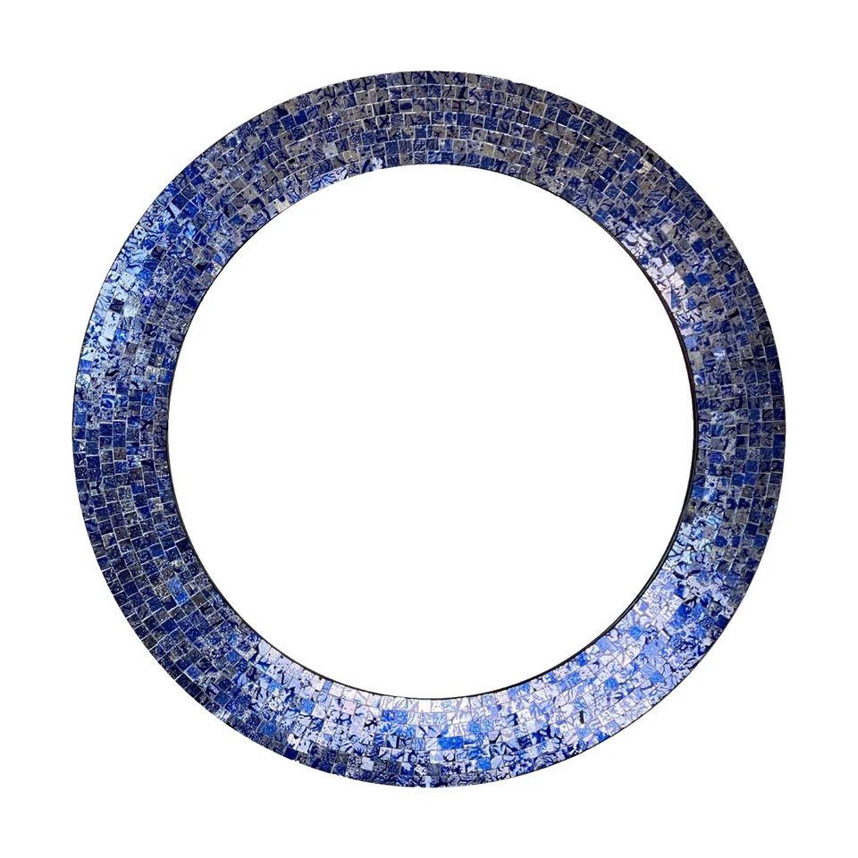 Espejo Mosaico Hecho a Mano China Rota Azul Blanco Floral 14.5" Firmado Usado en Excelente Condición